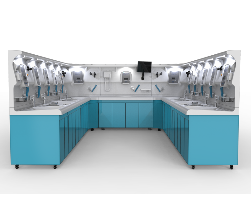 工作站配备高压水枪、高压气枪、水处理器、专用空压机、内镜烘干机等模块,构成完整的清洗流程体系。还配备消毒液隐藏柜、消毒液过期报警器等功能模块,提升管理便利性。